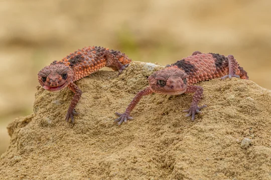 Coloración y patrones (bandas, tonos marrones/rojizos) les permite camuflarse en su entorno rocoso y arenoso.
